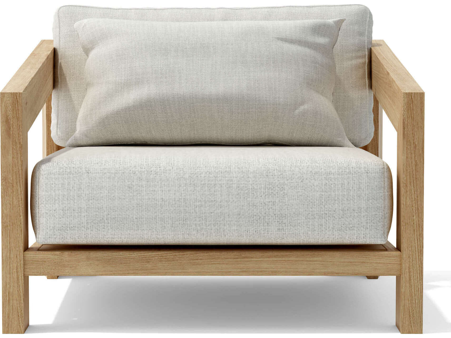 Featuring bold lines and a striking presence the Smyrna Lounge Armchair is a well-constructed and quality built deep seating armchair perfect for the home or outdoors. Made of premium grade unfinished teak it includes 5 ½” thick cushions and two pillows from All-Weather Sunbrella Fabrics. Take a seat in luxurious comfort as the spacious seating measuring 34” x 33” indulges you in. As part of the Smyrna Collection, be sure to add the Smyrna Sofa, Coffee Table, Sun Lounger, Dining Table and Dining Armchair.