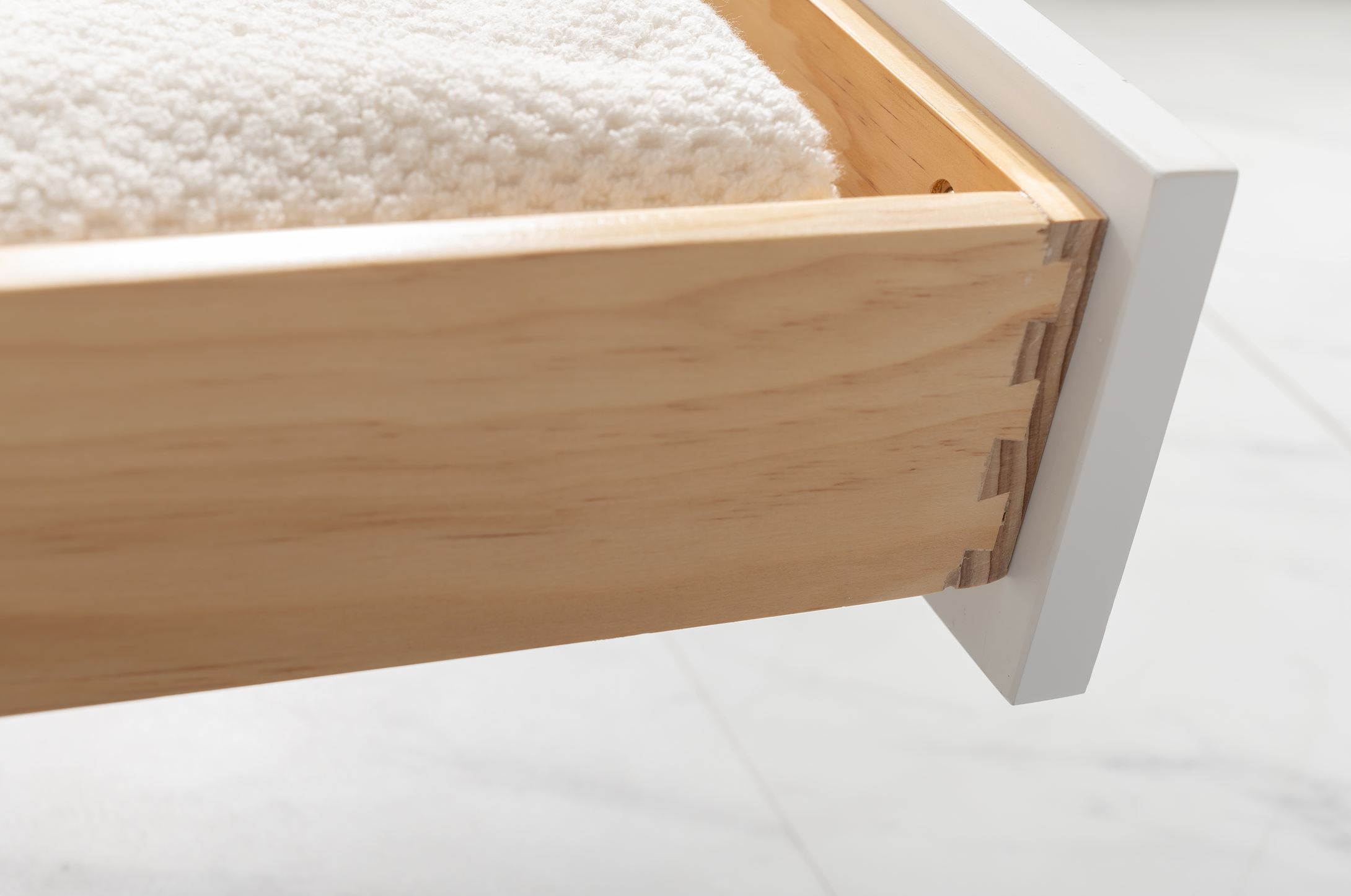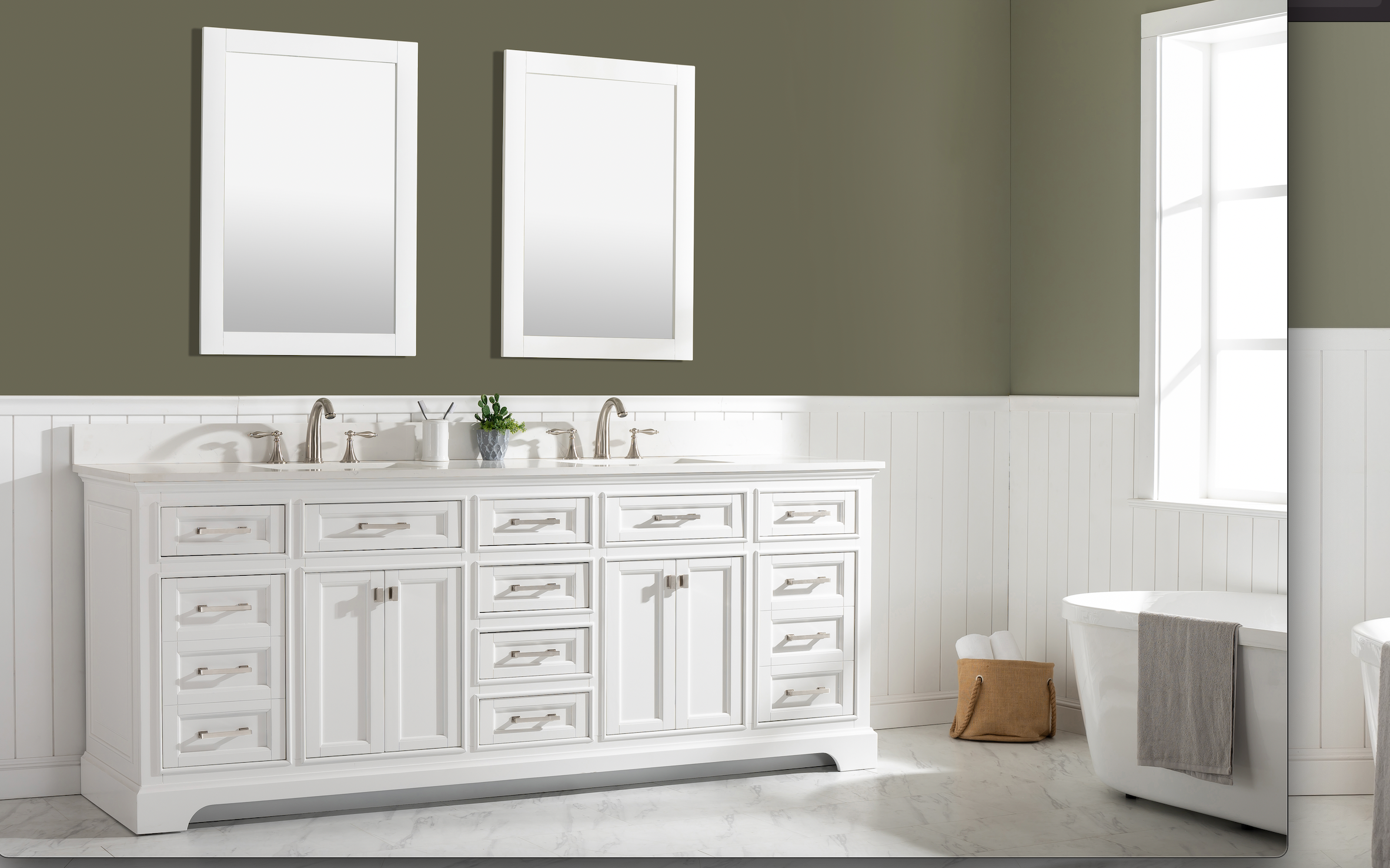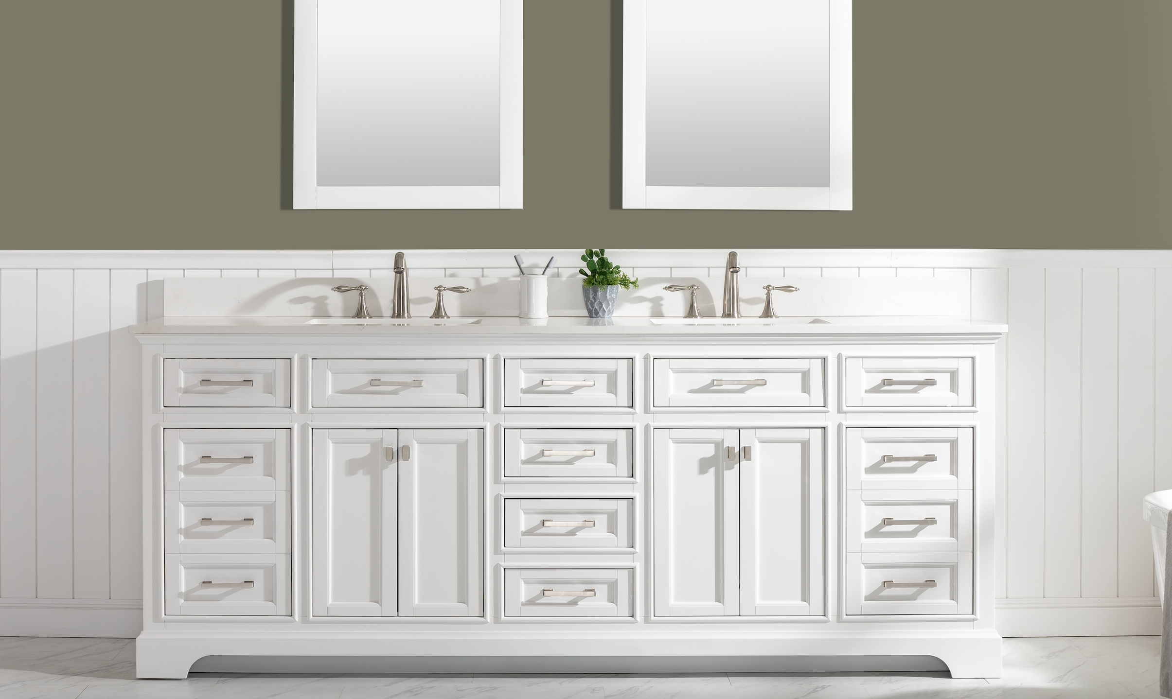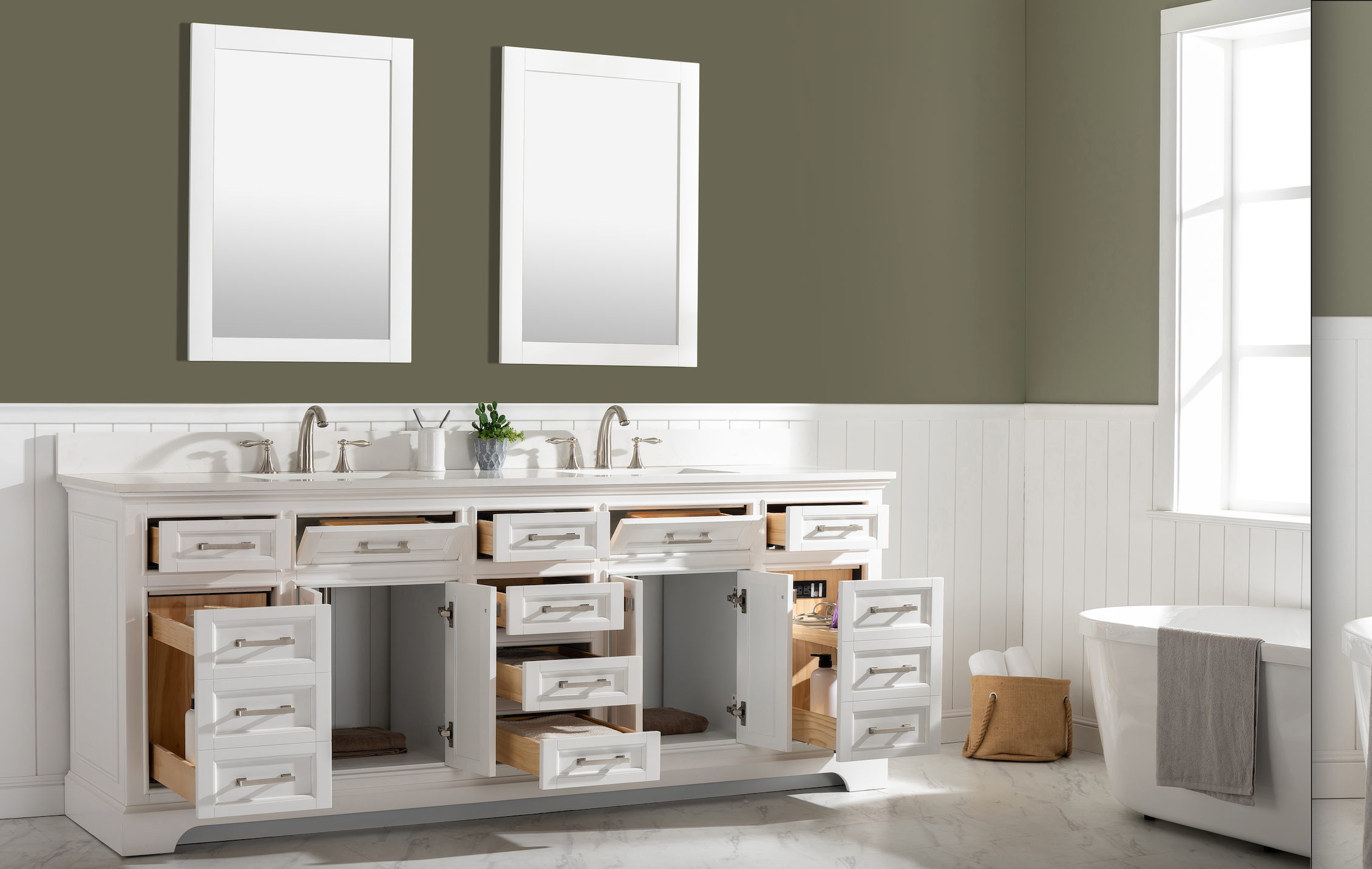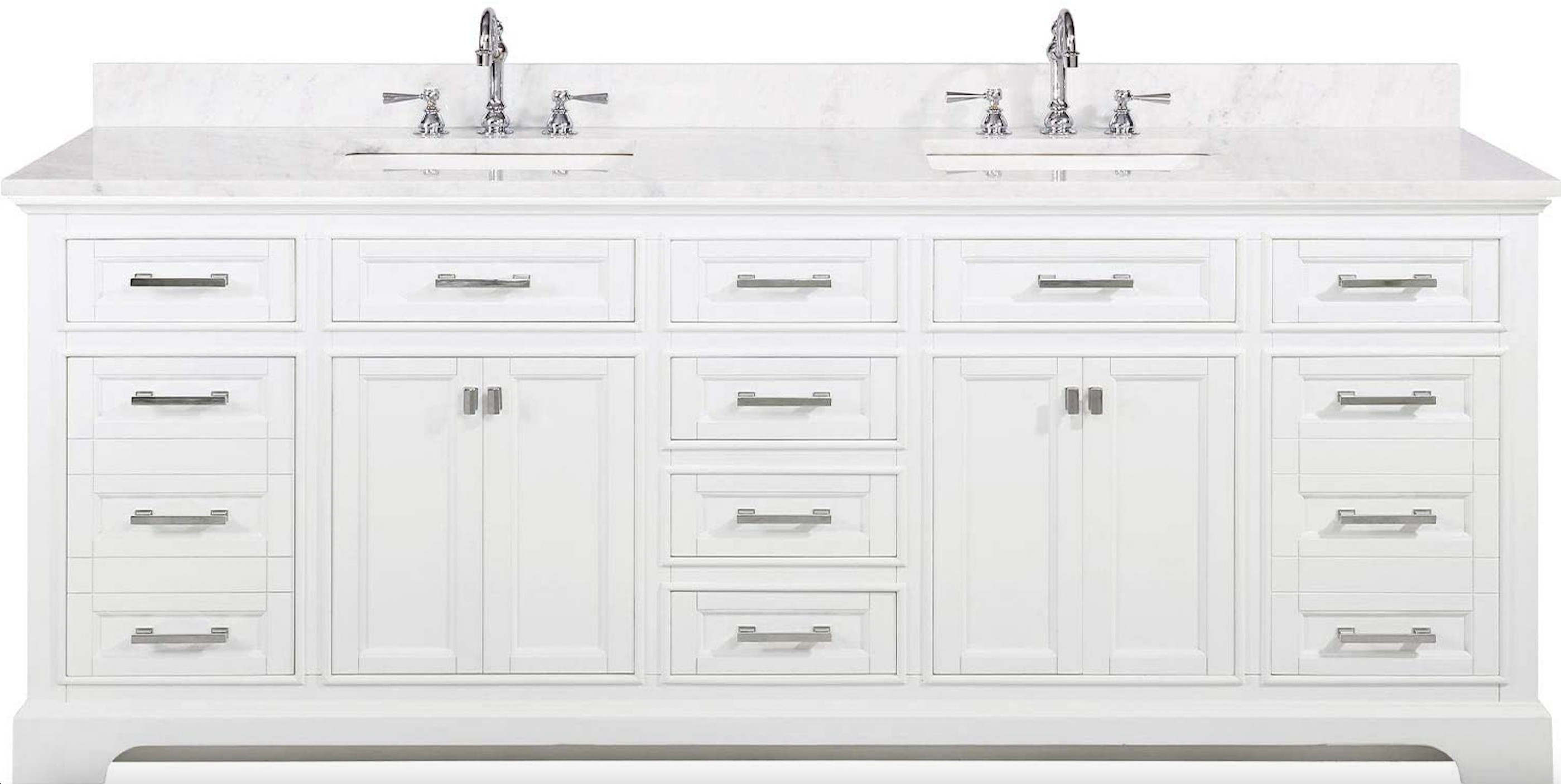 Soft closing doors and drawers provide smooth and quiet operations, while brushed finished metal hardware provides the perfect finishing touch. Other fine details include white porcelain sinks with overflow, dovetail joint drawer construction, predrilled holes to accommodate 8-inch widespread faucets, and multi-layer paint finish on the cabinets provide beauty and durability for years to come.
