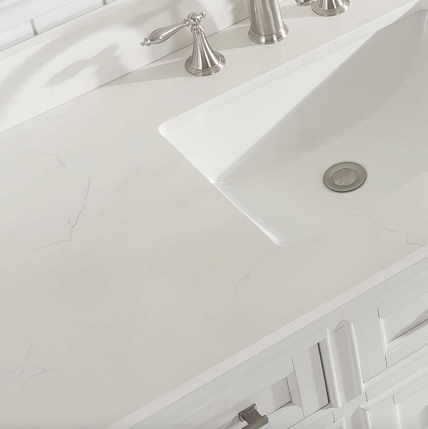 All Milano vanity cabinets are constructed from solid birch hardwood and paired with a 1 inch thick seamless Quartz countertop and backsplash.