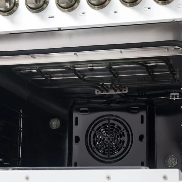 Elevate your culinary space with the Forno Galiano 48-Inch Dual Fuel French Door Range, a professional-grade appliance available in either sleek black or crisp white with elegant antique brass trim. This commanding range offers eight powerful sealed gas burners and dual electric ovens with a total capacity of 6.58 cu.ft. French doors make loading large dishes easier and safer, while cast iron grates, recessed enamel surfaces, and true convection cooking deliver style, precision, and efficiency in one premium package.
