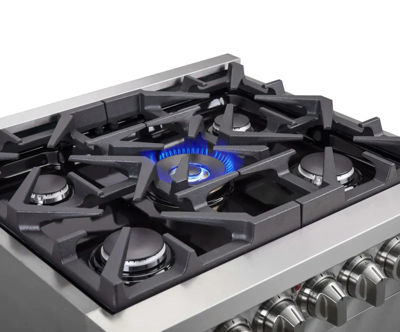 The Forno 30” Massimo French Door Dual Fuel Range brings professional styling and quality into your home kitchen with its durable stainless-steel design. Unique french doors take up to to 12" of less open door space and easily open simultaneously with one hand. Cooktop has 5 sealed burners with a total stove top output of 68,000 BTU including 1 sealed dual-ring brass burner for simmering delicate tasks like melting chocolate or cooking sauces, giving you the ability to cook up whatever delicious meals you desire. The heavy-duty continuous cast iron grates allow for even heat distribution and maximum stability of cookware mobility. A recessed enamel cooktop cavity keeps spills and splashes contained and is easy to clean.