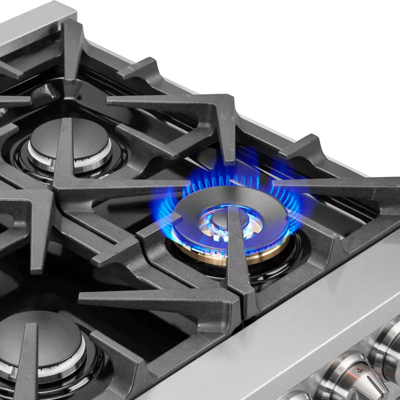 - Heavy-Duty Continuous Cast Iron Grates provide even heat distribution and stable cookware mobility