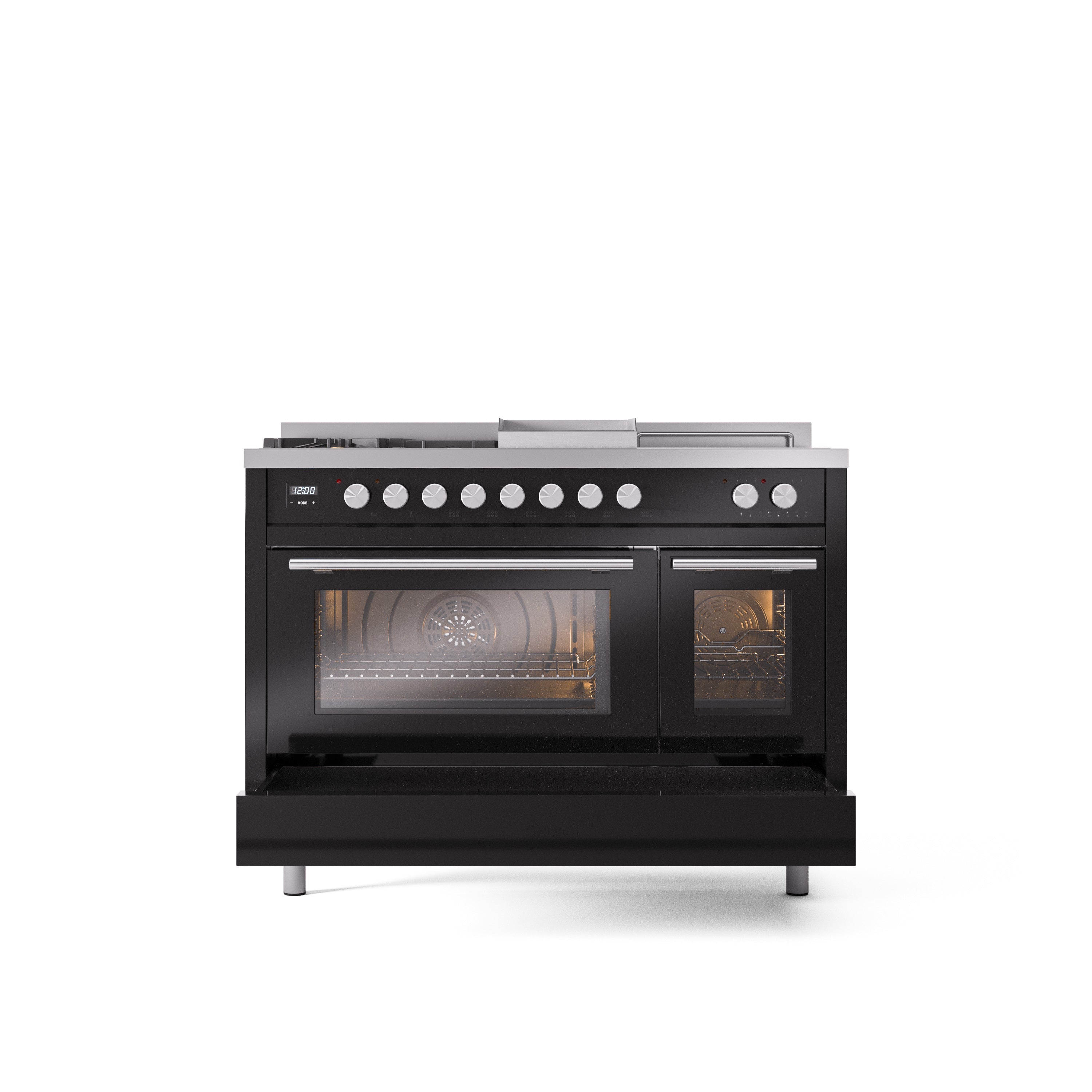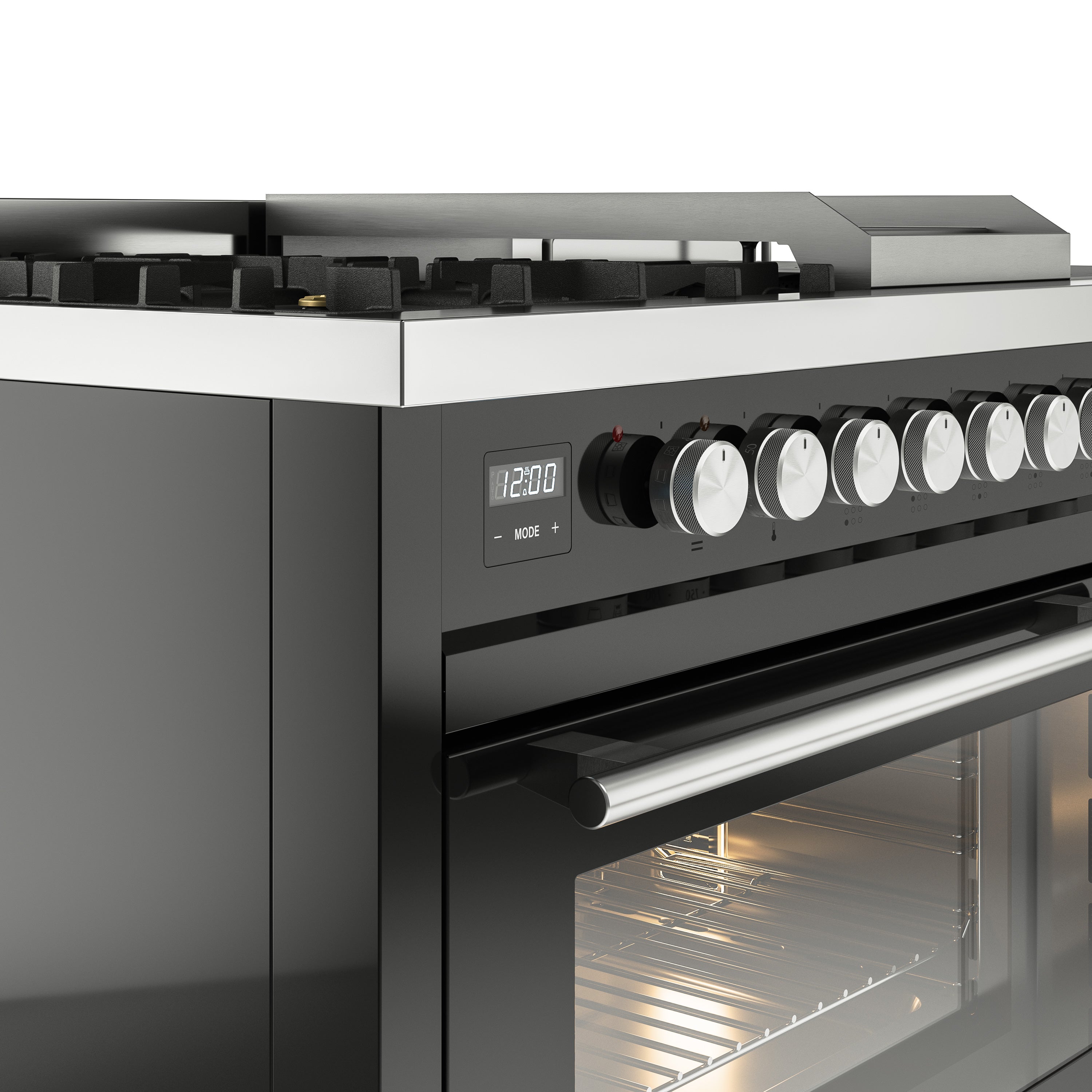 The Professional Plus range cookers are inspired by the kitchens of the best restaurants, bringing robustness, ergonomics and operability to the domestic space. They offer various set up options, from double ovens to gas or induction hobs. Available gas hobs range from 30 inch up to 60 inch with up to 8 burners and can be integrated with coup de feu and griddle. Induction hobs are flush-mounted, from 36 inch up to 48 inch: the latter version is equipped with no less than 6 cooking zones and the bridge function. The option of choosing different sizes, standard colors or upon request, the option of RAL colors, and metallic finishes, allows it to blend perfectly in any interior.