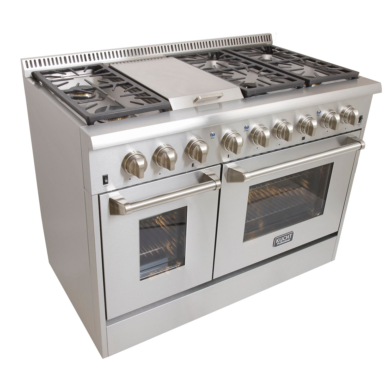 Extra-Large Kitchens Need a 48" Freestanding Dual-Fuel Range! Do you long for the perfect home range and oven? Even the most discerning home chefs will be pleased with the 48" wide Kucht KRD486F! This professional-grade range includes a high-intensity 18,500 BTU griddle as well as 6 high-quality cooktop burners. Not only that, but this top-of-the-line model comes with TWO different ovens, each with enough space to produce a full-fledged meal, plus plenty of extra storage. As with other Kucht ranges, the attention to detail combined with old-world workmanship will transform your current home kitchen into a professional chef's dream kitchen. You can't go wrong with having a kitchen if cooking is your life's passion. You can't go wrong with a Kucht if cooking is your life's passion! The attention to detail combined with old-world craftsmanship, as with all Kucht ranges, will transform your current home cooking area into a quality kitchen that any professional chef would be delighted to have in their own restaurants. You can't go wrong with a Kucht if cooking is your life's passion!