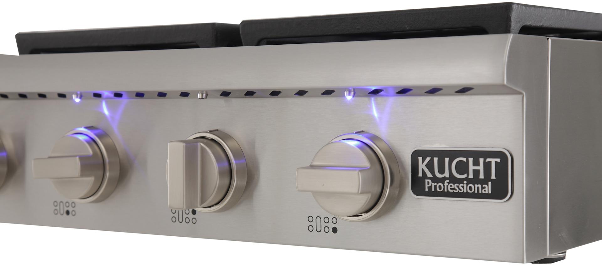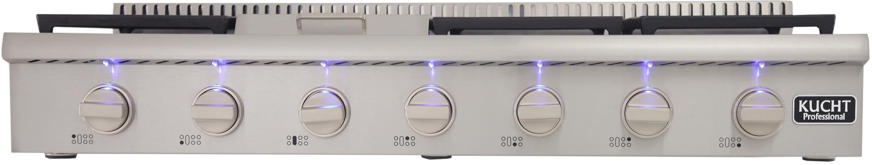 This 48" Professional Series gas rangetop from Kucht offers 6 sealed burners ranging from 18000 BTU to 12000 BTU output and a 18500 BTU griddle. This rangetop also features electronic ignition with auto re-ignition, black porcelain top, heavy duty cast-iron grates and high quality control knobs.