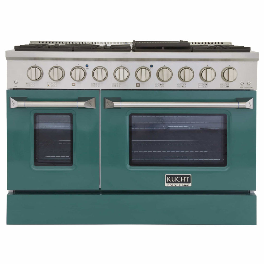 KUCHT Professional 48 in. 6.7 cu. ft. Range with Sealed Burners, Griddle/Grill and Two Ovens - One Convection - in Stainless Steel with Green Oven Doors