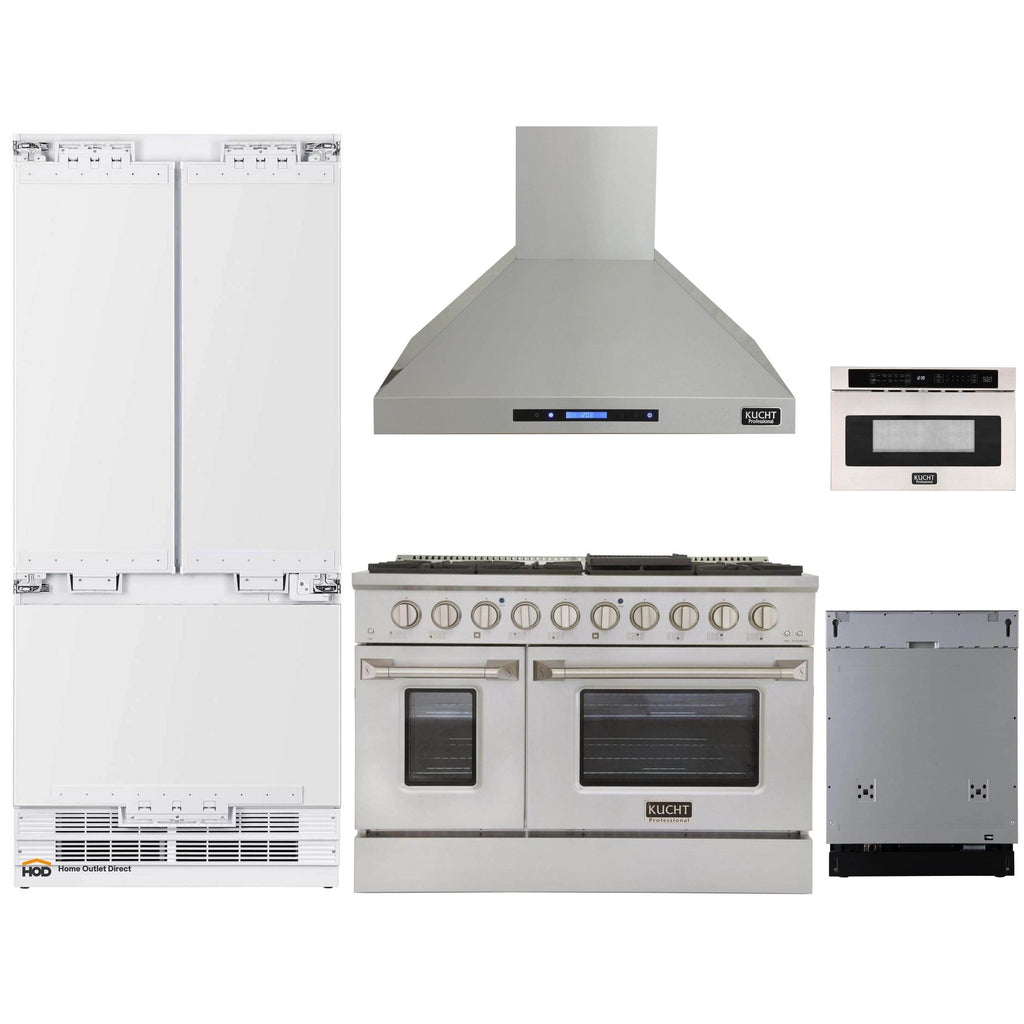Kucht 5-Piece Appliance Package - 48" Dual Fuel Range, 36" Panel Ready Refrigerator, Wall Mount Hood, Panel Ready Dishwasher, & Microwave Drawer