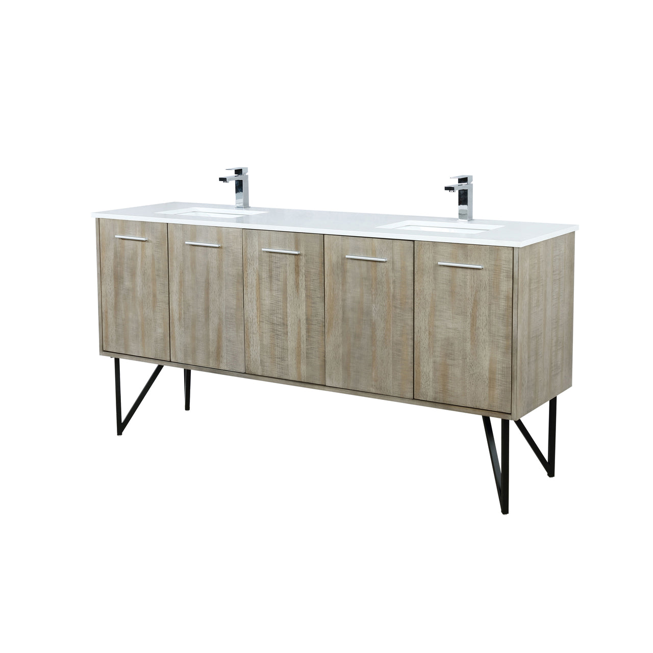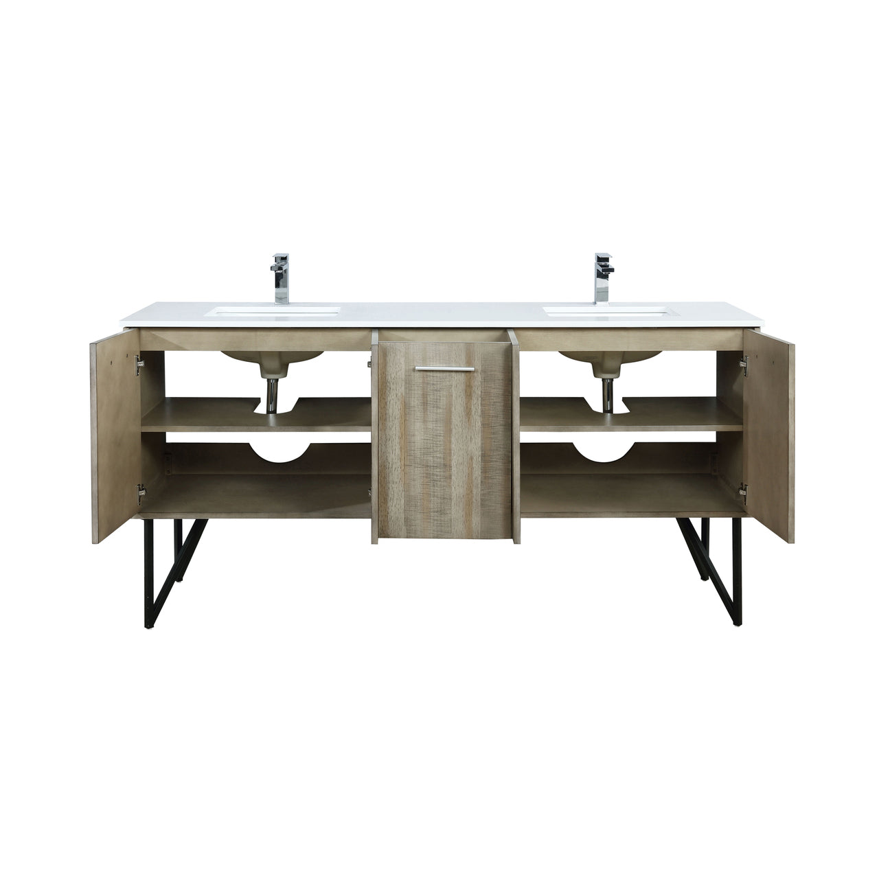 Lexora Lancy 72" Rustic Acacia Double Bathroom Vanity, White Quartz Top, White Square Sinks, and Balzani Gun Metal Faucet Set LLC72DKSOS000FGM