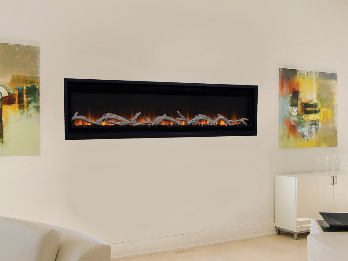 Transitional aesthetics: Features a smoked crystal ember bed and driftwood log set