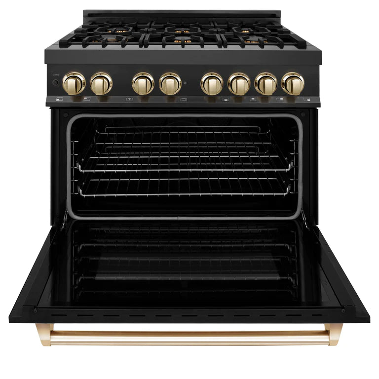 ZLINE Autograph 36 in. Gas Burner/Electric Oven Range in Black Stainless Steel with Gold Accents, RABZ-36-G